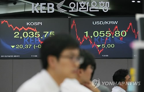 | 코스피, 중국 긴축 우려에 급락…2,040선 붕괴 (서울=연합뉴스) 박지호 기자 = 23일 코스피는 중국 긴축 우려에 전 거래일보다 20.37포인트(0.99%) 낮은 2,035.75로 거래를 마쳤다. 사진은 이날 오후 서울 중구 을지로 외환은행 본점 딜링룸의 모습. 2013.10.23 jihopark@yna.co.kr |
